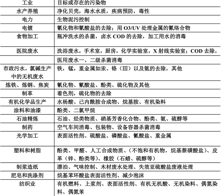 臭氧在應(yīng)用于中水回用易處理,出水效果好。處理廢水一般用于一、二級生物處理出水的殺菌消毒,但其他行業(yè)同時也廣泛應(yīng)用,比如利用臭氧氧化去除生物難以降解的或者有毒的化合物,以提高廢水生物氧化單元的效率,此外也可以用以減少污泥產(chǎn)量。其同時還是去除工業(yè)廢水中的有機(jī)污染物和無機(jī)污染物以及消毒。把這些工業(yè)廢水分成 21 類見表 1-1。包括:殺蟲劑生產(chǎn)和使用中產(chǎn)生的廢水、受五氯酚污染的木材或含二氧雜環(huán)己烷廢棄物的漂洗廢水、海水養(yǎng)殖廢水、家畜糞便廢水以及垃圾滲濾液等。臭氧主要用于處理這些工廠(焦化廠,石油精煉廠,塑料加工廠,制漿造紙廠,紡織廠,肥皂、清潔劑加工廠,食物、飲料加工廠等)產(chǎn)生的廢水中的酚類物質(zhì)。除此以外,臭氧也可以用來處理含有表面活性劑的廢水和染料廢水。這些廢水中的大多數(shù)化合物與臭氧直接反應(yīng)的速率常數(shù)都非常高,因此,臭氧有望成為減少或消除這些廢水污染的首選氧化劑。同時可以采用高級氧化技術(shù)(生物+O3 氧化);提高污水的可生化性。