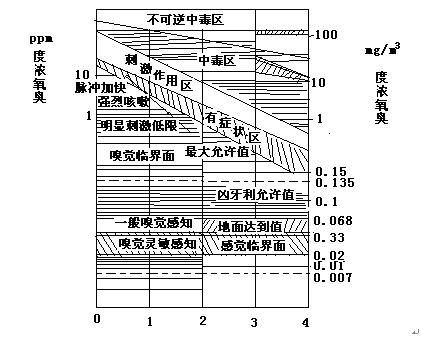 圖中刺激作用區(qū)以下范圍為無損害區(qū),即離開臭氧環(huán)境就很快得以恢復(fù)的影響區(qū)。圖內(nèi)縮指“感覺”為嗅到臭氧的特異性氣味;“刺激”是呼吸道黏膜有反應(yīng),感到口干、咳嗽、較強(qiáng)刺激有嗓子痛、疲乏等感覺,需要幾個(gè)小時(shí)得以恢復(fù)。文獻(xiàn)明確指出刺激作用區(qū)以上部分(中毒區(qū))為推測值。至今世界上無一例因臭氧中毒死亡事故。