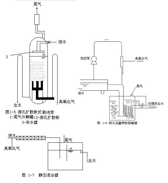 高性能臭氧氧化法處理效果的主要因素除污染物的性質(zhì)、濃度、臭氧投加量、溶液pH值、溫度、反應(yīng)時(shí)間外,氣態(tài)O3的投加方式亦很重要。O3的投加通常在混合反應(yīng)器中進(jìn)行?;旌戏磻?yīng)器(接觸反應(yīng)器) 的作用有二;①促進(jìn)氣、水?dāng)U散混合;②使氣、水充分接觸,迅速反應(yīng);③增長(zhǎng)臭氧氣體在水中的停留時(shí)間;設(shè)計(jì)混合反應(yīng)器時(shí)要考慮臭氧分子在水中的擴(kuò)散速度和與污染物的反應(yīng)速度。當(dāng)擴(kuò)散速度較大,而反應(yīng)速度為整個(gè)臭氧化過(guò)程的速度控制步驟時(shí),混合接觸器的結(jié)構(gòu)形式應(yīng)有利于反應(yīng)的充分進(jìn)行。屬于這一類(lèi)的污染物有烷基磺酸鈉、焦油、CODcr 、BOD5、污泥、氨氮等,反應(yīng)器可采用微孔擴(kuò)散板式鼓泡塔。當(dāng)反應(yīng)速度較大、擴(kuò)散速度為整個(gè)臭氧化過(guò)程的速度控制步驟時(shí),結(jié)構(gòu)型式應(yīng)有利于臭氧的加速擴(kuò)散。屬于這一類(lèi)的污染物有鐵(II)、錳(II)、氰、酚、親水性染料、細(xì)菌等,一般凈水處理可采用噴射器作為反應(yīng)器,效果較為理想。