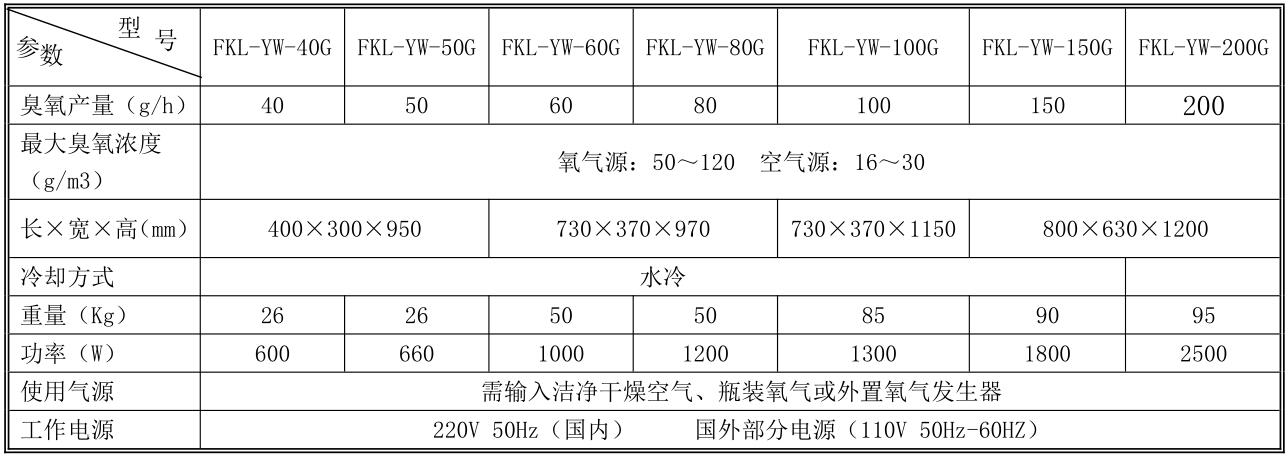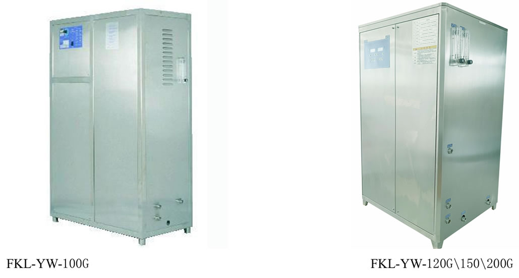 工業(yè)桶裝水、純凈水處理設備、污水處理、中水回用、空氣殺菌消毒( 食品車間消毒、 實驗室、 冷庫消毒、GMP\HACCP 車間凈化) 、 中央空調(diào) 循環(huán)冷卻水消毒、養(yǎng)殖消毒等技術(shù)參數(shù)、圖表: FKL-OZ-10~40G( 注:以下參數(shù)、機器圖片可能有適當變動 )